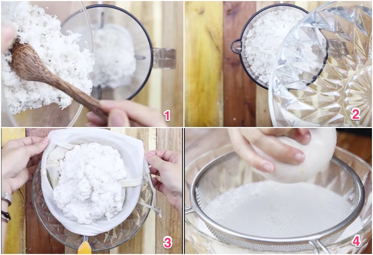 - Vắt lấy khoảng nửa lít nước cốt dừa, nên lọc qua rây 2 lần để loại bỏ cặn.