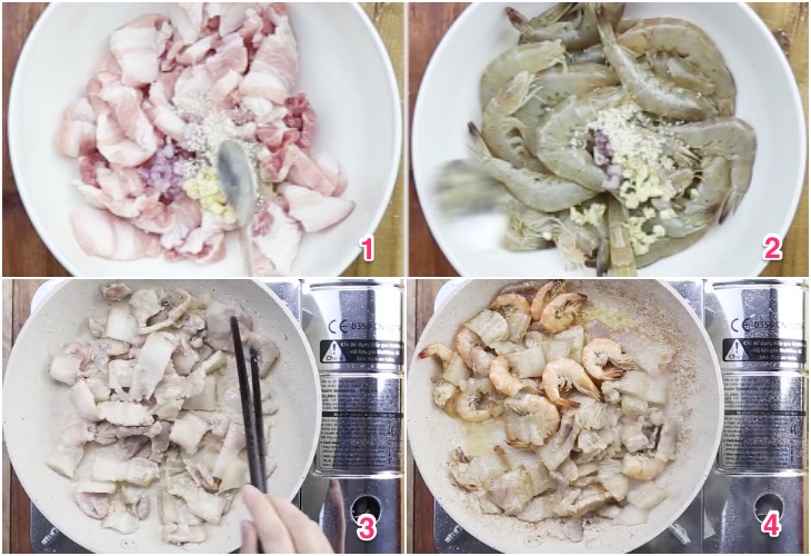 - Tôm, thịt ba rọi rửa sạch, thịt cắt lát mỏng vừa ăn. Ướp tôm thịt với 1 muỗng cà phê hành tỏi băm, ½ muỗng cà phê tiêu, ½ muỗng cà phê hạt nêm, 1 muỗng cà phê đường, để trong 15 phút cho thịt ngấm gia vị.